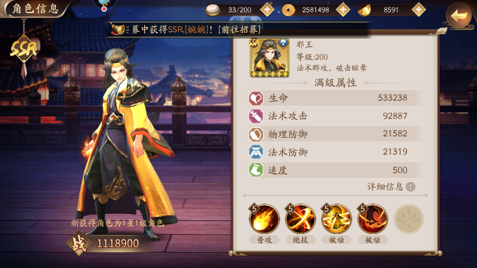 2、角色评价:邪王是SSR最好用的法师角色,虽然自身没有什么特殊的效果,但是胜在输出稳定且容易升到满星。