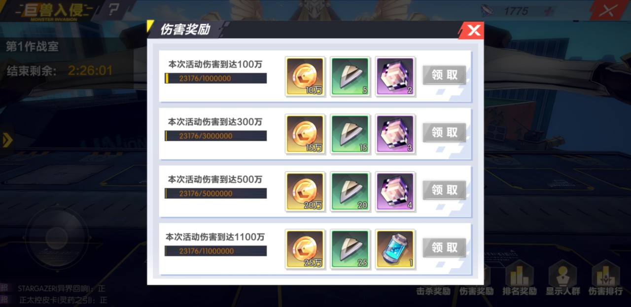 注意:每天玩家在使用完次数之后可以进行一次购买,只需要花费十个钻石,并一天的伤害量达到奖励要求就可以获得奖励了。