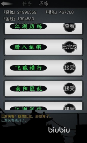 当然,每一个师傅所传授的基本拳脚都是不一样的,玩家可在武学界面进行选择,对应的师傅需要解锁的任务也会有所差别,如果想要拜师的话,可以直接进入师门界面,与当前师门的人物进行互动,了解不同门派的背景,购买技能、残决业或者是向师傅请教都是可以的,等达到特定的条件之后,玩家就可向对应的NPC进行请教,提升自己的技能。