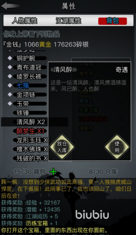 再前往下一个地点解锁特定地点任务,可以在西厢房挑战李安平获取长剑,挑战魏冲获取单刀,在小店挑战地痞流氓,可以获取一定的银两,还可以在林间大道挑战野狗,获取狗肉。最后,我们在居民的帮助下获取钥匙。完成华亭村的任务,解锁燕楼地图,之后再与店小二进行交易,能够获取大量的好处。最后玩家就可回到燕楼,将燕楼获取到的陈年女儿香带回去,这个任务就算彻底结束了。
