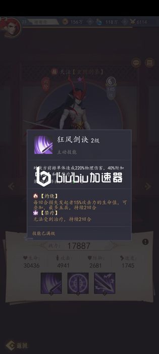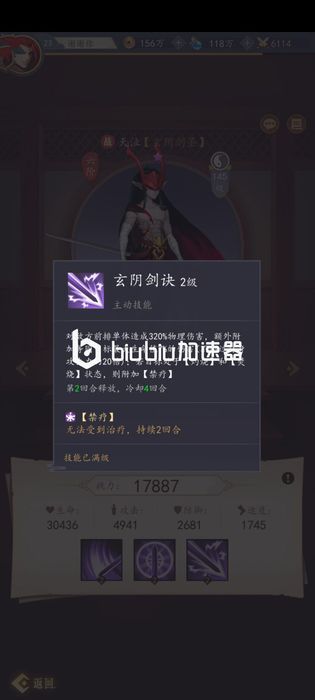 玄阴剑圣只有三个技能,其中两个是主动技能,分别是狂风剑诀和玄阴剑诀,狂风剑诀的技能效果是选取敌方一个前排,其造成自身物理攻击力220%的伤害,并且有40%的几率会施加一个灼烧和禁疗效果。 玄阴剑诀是对敌方前排一个单位造成自身物理攻击力320%的物理伤害,并且会额外的造成目标最大生命值7%的伤害。