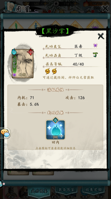 接下来的“寒阴绵掌”和“黑沙掌”同样可以产生非常棒的配合效果,前者可以在攻击的时候,对敌人施加上一层中毒效果,每一回合都会使对手持续掉血。后者黑沙掌在进攻之后,可以帮助角色恢复一定的内力,让角色可以使用更多的卡牌去攻击敌人。