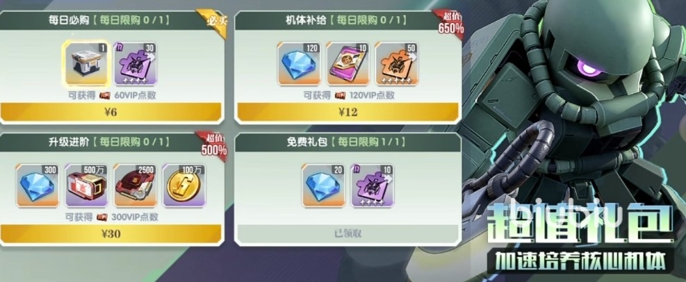 至于超值礼包的话,玩家们可以看下这个礼包中的道具是否是自己需要的。其实只要能把机甲的战斗力提升起来的话,在后续的副本中能快速扫荡出品质够高的道具来。
