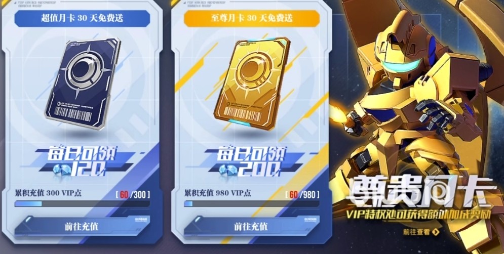 在氪金上,首要推荐的还是月卡,月卡分为两档,分别是超值月卡和尊享月卡。充值月卡是就一个长期观望的机制,通过月卡每天能领取到一定的钻石奖励。钻石奖励主要就是用来增加抽卡池的次数,在后续的游戏中必然还会推出限定的机甲,拥有足够的钻石就能直接拿下。