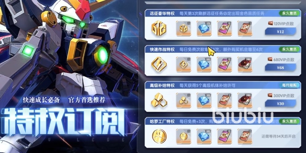 最后就是特权订阅了,在这个板块中能订阅的内容有很多,在这些类目中最为推荐的就是“快速作战”特权,这个能帮助玩家快速完成扫荡,这样的话就能快速追上大部队的等级,在对战过程中也更容易获胜。