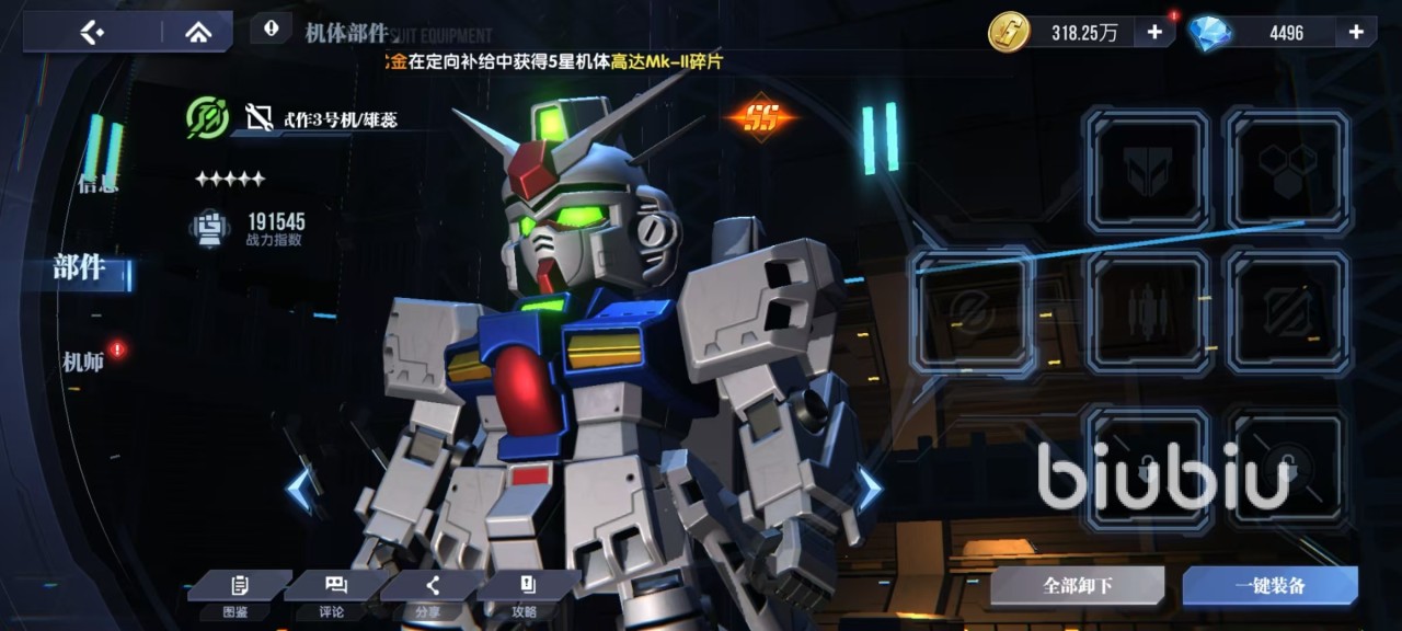 在机体部件方面一共分为部件和特殊部件这两种,不同的部件搭配起来,会有套装属性提升,其实就是其他游戏中的装备,这里只是换了一个说法。特殊部件可以在穿戴后点开详情介绍界面,然后点击升星按钮来提升星级。特殊部件星升星,需要其他特殊部件作为消耗材料,通过部件合成界面进行合成,就可以获得各种部件。如果仓库中有合适选项,通过一件装备功能,就可以全部自动选择出来,这样操作起来更方便。