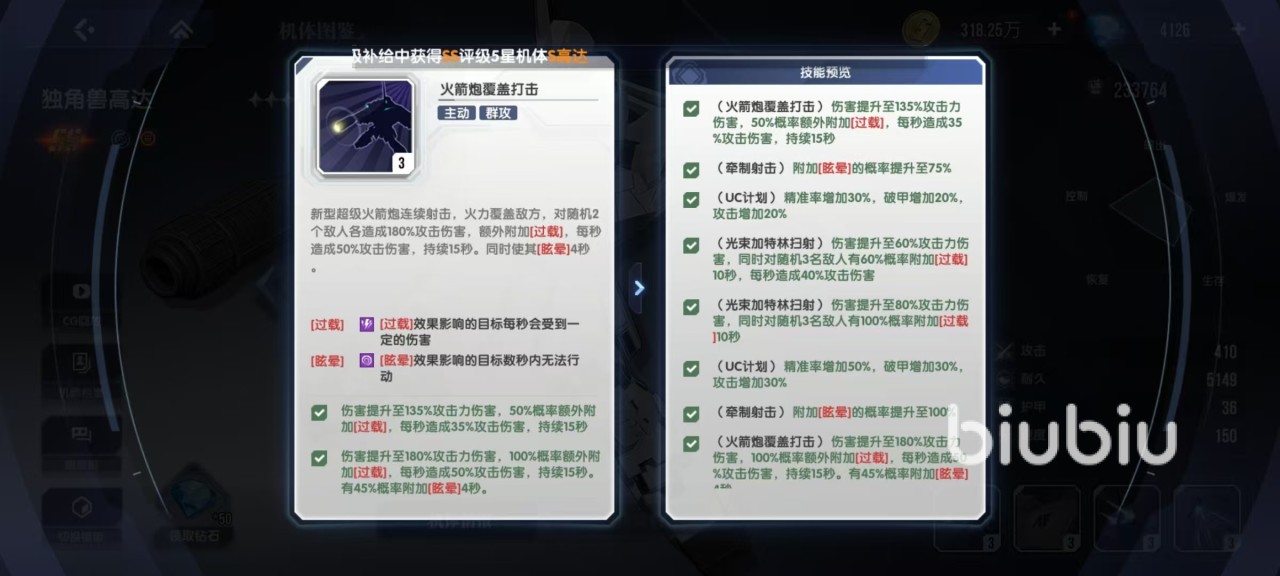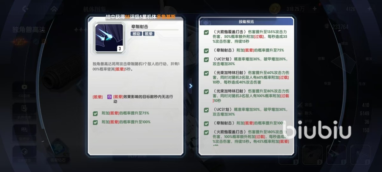 该技能虽然伤害目标少一些,但是打出的伤害数值绝对非常出色,还有额外控制效果,所以强度很高。接下来是三个被动技能,第1个uc计划,作为联邦uc计划的旗舰机体,独角兽高达能够增加50%精准属性,30%破甲和30%攻击,这样的被动增强在同级别的机体中,也是非常出色的一个。2个被动牵制射击,独角兽高达用攻击牵制随机一个敌人的行动,100%几率使其眩晕5秒钟,被眩晕影响的目标在持续时间内是无法进行行动的,这也是控制的一部分。