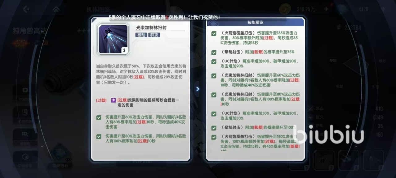 第三个被动光束加特林扫射,当独角兽高达的耐久值首次低于50%,会对全体敌方目标都造成80%攻击力的伤害。同时还会对随机三名敌人施加长达10秒的过载效果,每秒造成20%攻击伤害,该技能只能触发一次。通过技能效果大家已经看出,无论是在伤害还是控制方面,独角兽高达都是非常出色的人选,这也使其能够成为阵容搭配中的绝对核心。