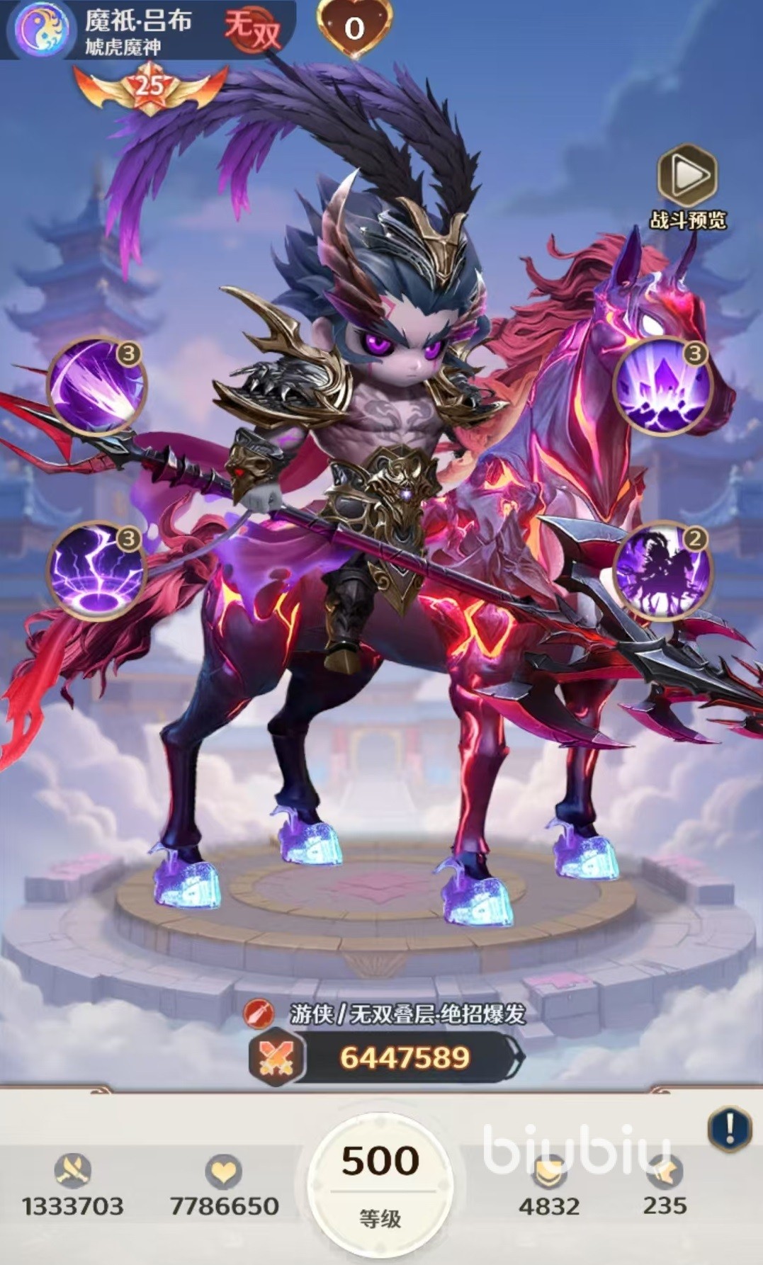 目前排在第一的当属魔吕布,魔吕布是现在独一档的存在,他所具有的无双叠层能力,拥有极强的绝招爆发输出。大招可以对敌方全体造成高额物理伤害,并有几率附加神罚,如果敌方目标数小于或等于三个,本次伤害还有暴击率提升的效果,使用之后自身可以获得一层无双。无双是吕布的看家本领,身上的无双和天下无双层数越高,大招所造成的伤害就越多,只要能通过其他技能将无双叠加起来,魔吕布开大可以直接秒杀全场。