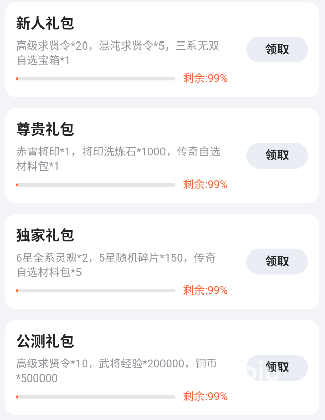 上面这个福利是全平台的,但福利还没完呢!九游app还有专属的新人礼包、尊贵礼包、独家礼包、公测礼包,内涵超多求贤令,也就抽卡券,甚至还有三系无双自选箱,赤霄将印、5星随机碎片等珍惜材料。这些礼包是限量的哦,现在余量充足,大家抓紧时间冲!