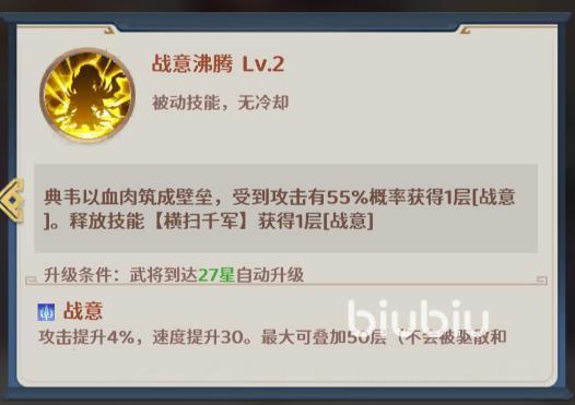 另一个被动“战意沸腾”,受到攻击有一定概率获得1层战意,释放主动技能的时候也会获得1层战意,每层战意可以提供4%的攻击力和30点的速度加成,最多能叠50层,并且该效果是不会被驱散和偷取的。