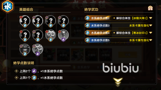 ③水系绝学(水系绝学·残):10名羁绊英雄满羁绊为5,上阵1个水系绝学(2个水系绝学·残)+1绝学点数