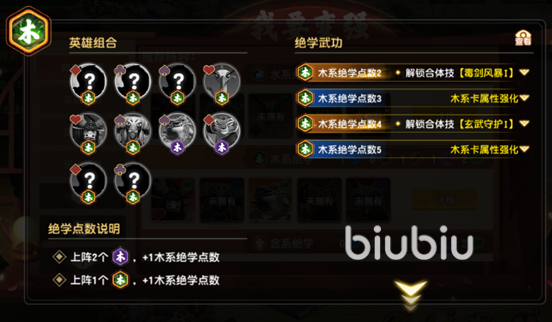 ②木系绝学(木系绝学·残):10名羁绊英雄满羁绊为5,上阵1个木系绝学(2个木系绝学·残)+1绝学点数