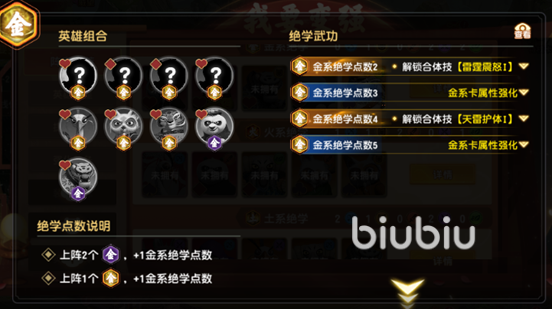 金系绝学点数4:合体技天雷护体(战斗开始后,所有合体英雄添加自身值为最大生命的闪电盾,受到攻击有30%几率眩晕敌方2秒并提升攻击力持续30秒)