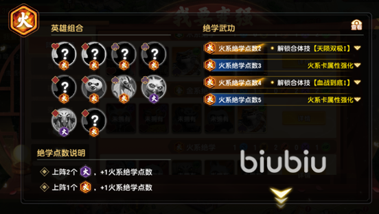 火系绝学点数4:合体技能血战到底(合体阵容中更强的英雄在血量低于50%时触发无敌,每个英雄各触发一次)
