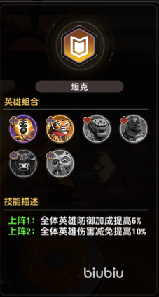 1坦克:全体英雄防御加成+6%
