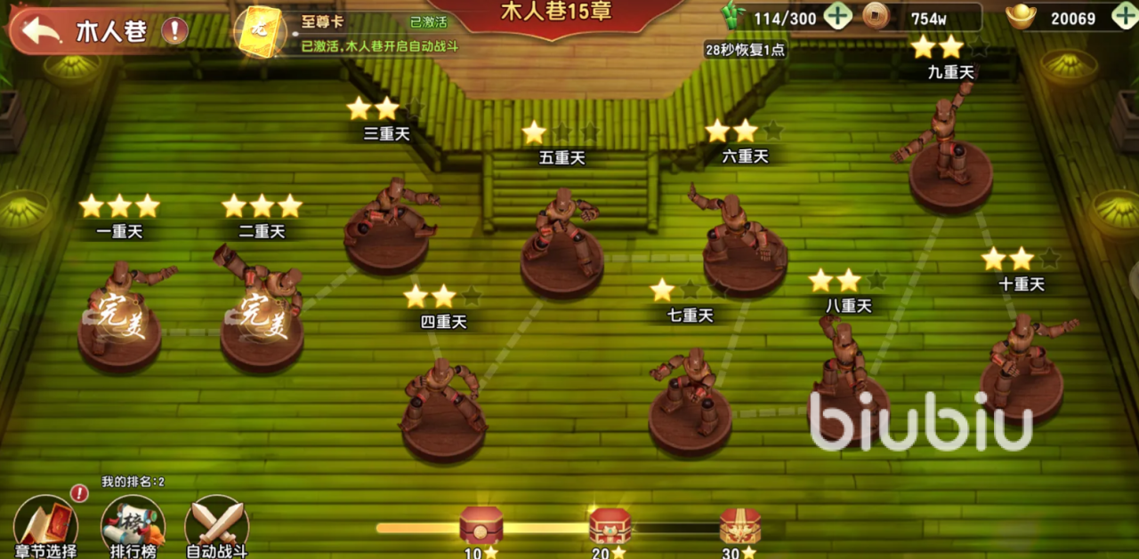 木人巷需要从游戏里面的“冒险”入口进入,每一层包含10个关卡,每个小关卡最多可获得三星的评价。每一层累积达到10星、20星、30星的时候,就会解锁对应的档位奖励。需要注意的是,每一层挑战只需获得一星就能自动解锁通关,通往下一层,每通关10层才会解锁下一章节的木人巷内容,同时难度和奖励也会相应的提升。