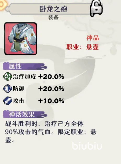 卧龙之袍限定职业为悬壶,能加20%治疗加成、20%防御和10%攻击,它的效果是在战斗胜利时,治疗己方全体90%攻击的气血,提升队伍整体的容错率。