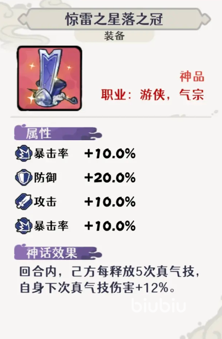 星落之冠限定气宗、游侠,能带来10%暴击率、20%防御、10%的攻击加暴击率,它的效果为在回合内,己方每释放5次真气技,自身下一次的真气技伤害就加12%。