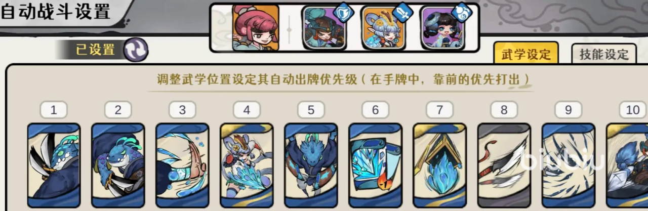 例无虚发2、追月飞刀2、拂袖神功1和飞刀1,自动出牌可以像下图一样设计,水木灵儿能回复队友200%攻击气血的回复技、银枪公子让队友获得300%防御护甲的技能都是选择立刻释放,无情的技能选择在武学释放结束后使用。