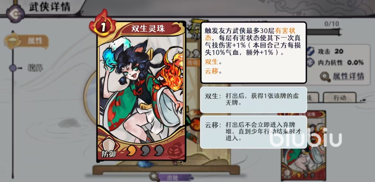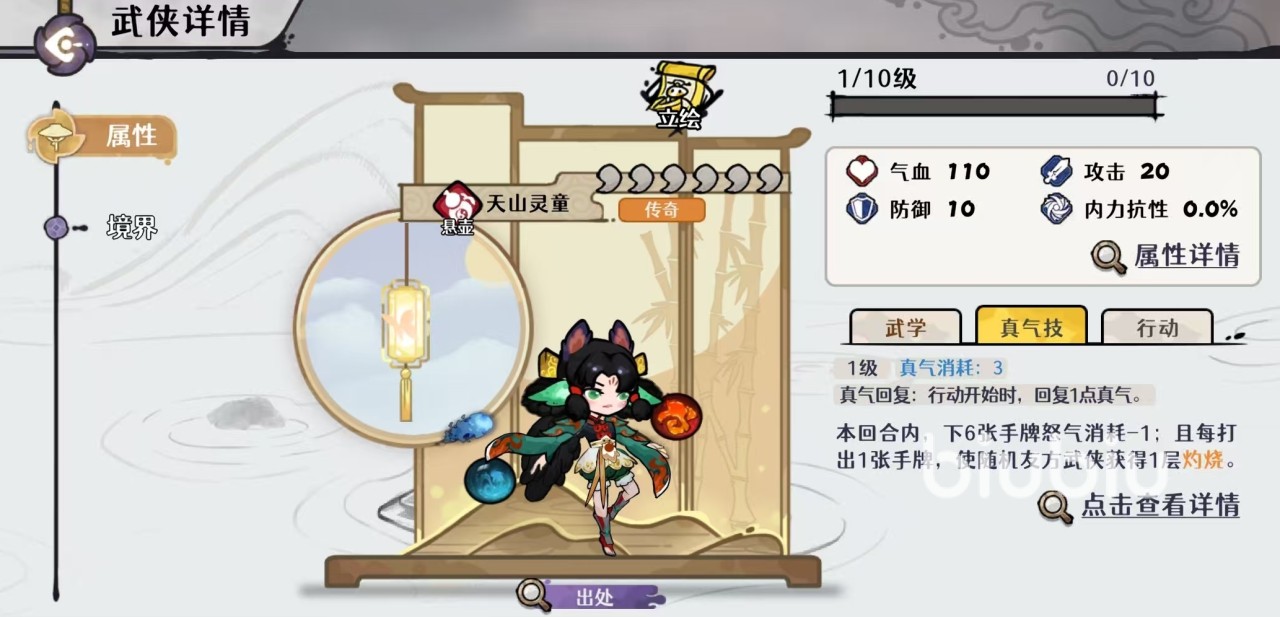 天山灵童的武学技能双生灵珠,可触发己方武侠最多30层有害状态,每层有害状态可以使其下一次真气技能伤害加1%,本回合己方每损失10%的气血,就可以额外增加1%的伤害。真气技能效果是行动开始恢复一点,真气技能效果是本回合内下6张手牌怒气消耗减1,每打出一张手牌,就可以使随机友方武侠获得一层灼烧。这个角色最大的特点就是补全了自残体系的最后一块拼图,它能够降低怒气消耗,增加真气技能伤害,还能复活队友,在满经脉时全武侠暴击伤害加8%,很适合走自残体系和火系爆发体系。