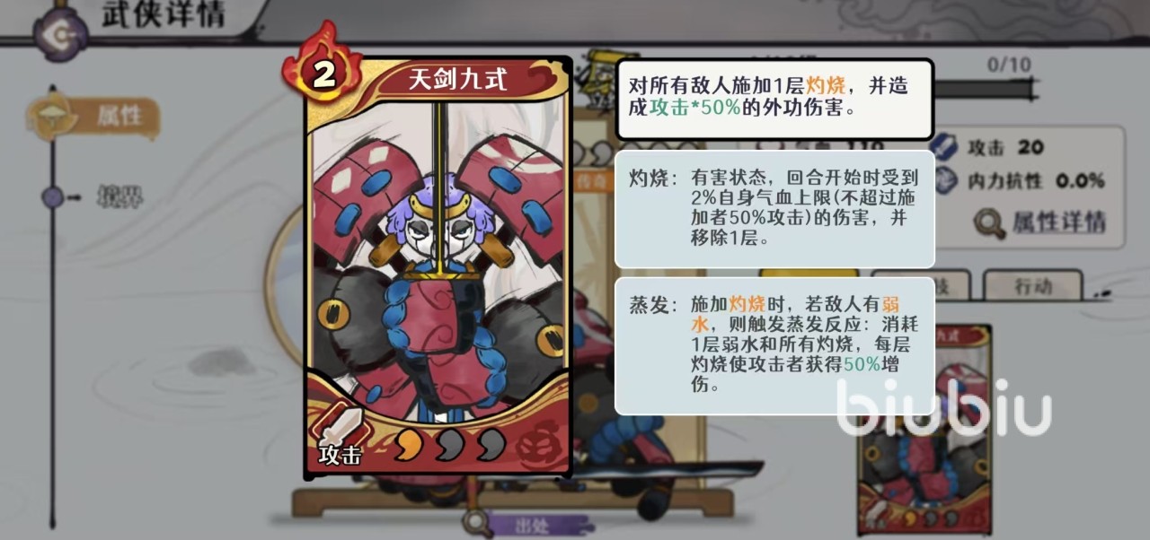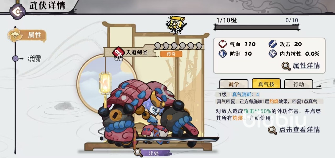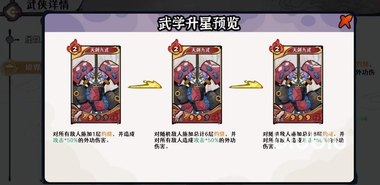 天道剑圣是属于游侠定位,它可以频繁对敌方造成伤害。自身的武学技能是天剑九式,对所有敌人施加一层灼烧,并附加外功伤害。灼烧是属于有害状态,回合开始时受到自身血气上限2%的伤害,并移除一层。如果在施加灼烧时敌人有弱水,则触发蒸发反应,消耗一层弱水和所有灼烧,使得攻击者获得增伤效果。真气技能效果是对当前敌人造成外功伤害,并点燃所有的灼烧,该技能可自动使用。这个角色定位是火系游侠主c,依靠灼烧回真气,高频自动释放真气技能,打出外功爆发。