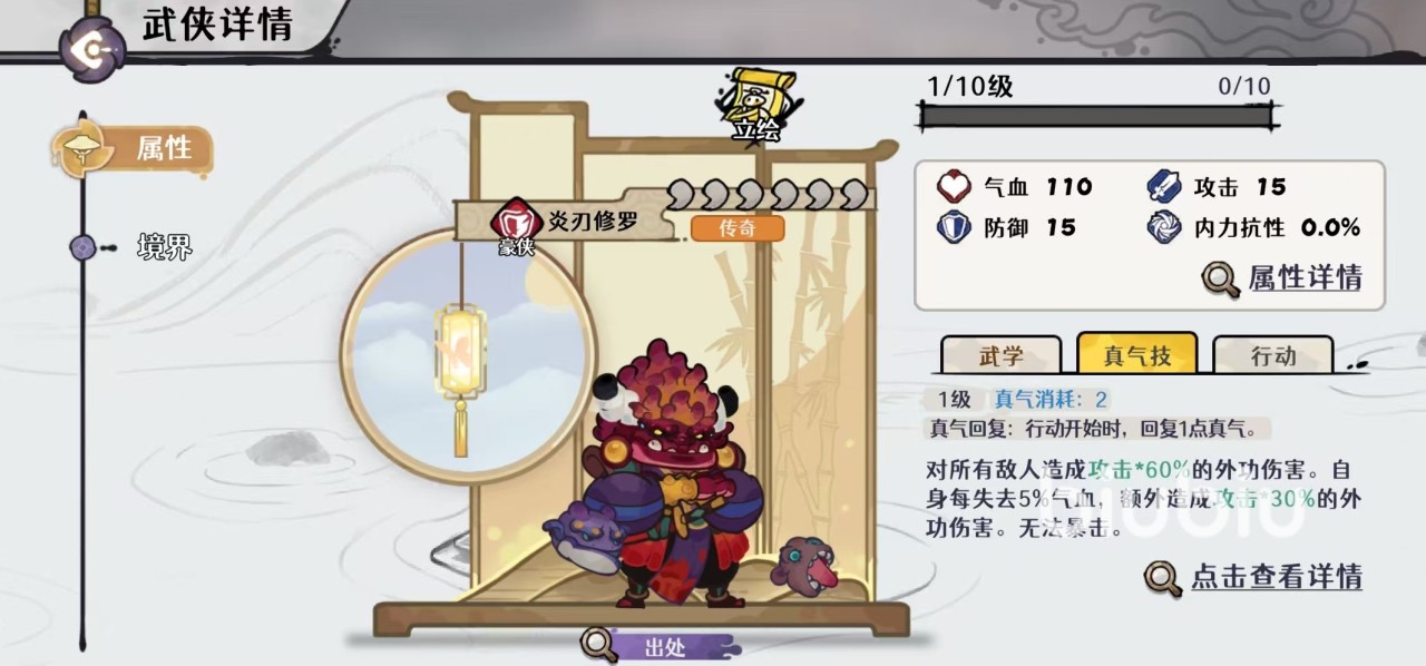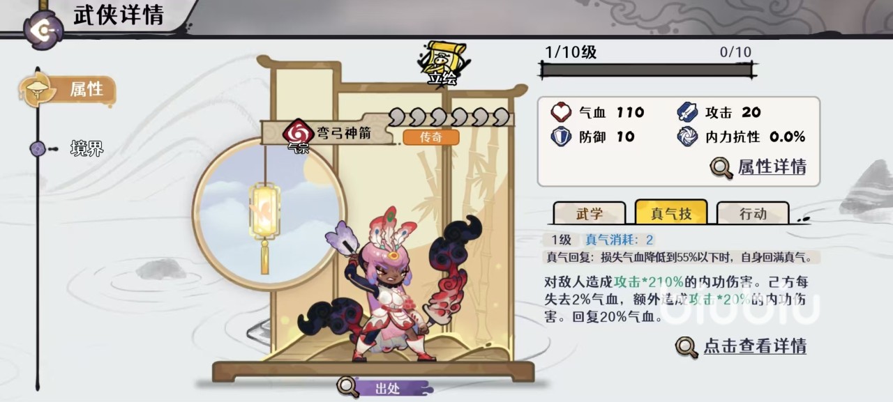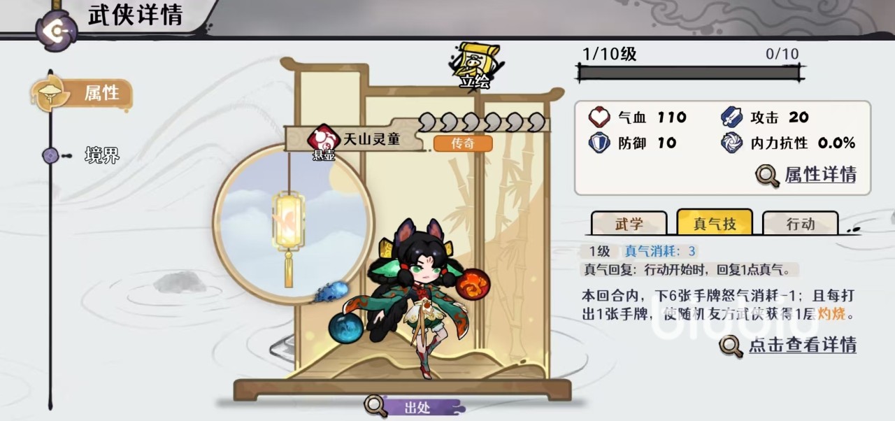 自从这款游戏中出现了天山灵童之后,以灵童和弯弓神箭为主要角色的自残队,就迎来了真正的强势时刻。天山灵童作为集合了增伤、回血、复活,减怒于一体的强势角色,以一己之力将此玩法拉到了极高的程度。这套阵容搭配中c位选择的是弯弓神剑,需要达到四命,效果是战斗开始时,如果自身气血高于75%,则扣除20%的气血,永久增加10%的攻击。回合开始时如果自身气血低于55%,则恢复到55%的气血。就这样不断自残不断循环,叠加伤害非常恐怖,辅助是天山灵童,三命时就已经够用,四命时最好。每己方武侠气血降低到55%以下的时候,使其下一击伤害增加15%。