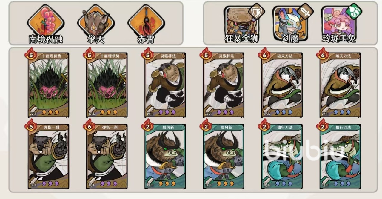 最后是狮子的装备,选择饮血四件套加踏风逐云的搭配方式,踏风逐云用来给少年加护甲,神话效果越接近200%越好,装备前缀优先级铁衣最高,其次是养元。在武学方面,选择土系八张,2个十面埋伏、2个灵猴棍法、2个破天刀法和2个弹指一刹,风系四张,2个烈风斩和2个独行刀法。古器选择方面搭配赤阳珠、沧澜链和魍面,这三个古器加成都是和少年攻击力相关。
