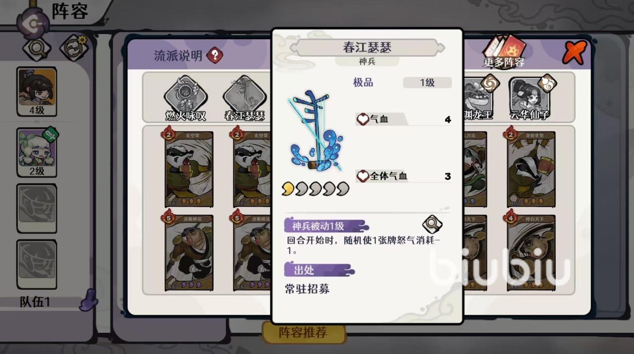 气宗位置选择的是临渊龙王,也是这套搭配的核心,他的武学卡牌是玉龙杖法,对敌人造成90%攻击的外功伤害,所有其他手牌每有一点怒气消耗,额外造成50%攻击的外功伤害。真气技能效果是打出手牌中怒气消耗最高的一张攻击元素牌,不消耗怒气。悬壶位置选择的是云华仙子,武学卡牌效果是抽两张牌,有暴怒效果,如果当前怒气足够则额外花费2点怒气触发暴怒,改为抽三张牌,且优先武侠卡牌。真气技能效果是恢复2点怒气,并使少年获得三层攻击增强。在神兵选择方面,小编推荐的是燃火咏叹、春江瑟瑟和林暗惊风。