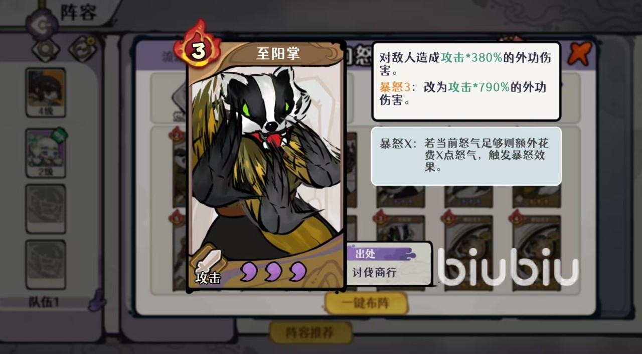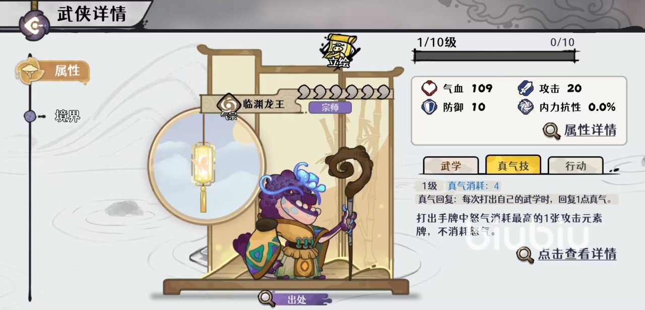 回怒流玩法的核心是抽满手牌,然后打出临渊龙王的武侠卡牌玉龙杖法,利用暴怒牌的高怒气消耗打出巨额伤害。在决策选择方面,豪侠位置选择的是狂暴金师,这是一个宗师级角色。他的武学卡牌竭力之护,效果是可使目标获得30%防御的护甲,并获得力竭效果,该效果是消耗所有怒气后触发,每点怒气可以额外获得60%防御的护甲。真气技能是没有护甲的随机友方获得300%防御的护甲,如果都有护甲,则回复2点怒气。