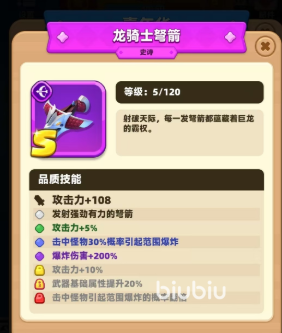 龙骑士弩箭作为史诗级,可以说是玩家手中的神器,它能增加108点的攻击再提升5%的攻击力,击中怪物同样有30%几率引起爆炸,爆炸的伤害还会再增加200%。