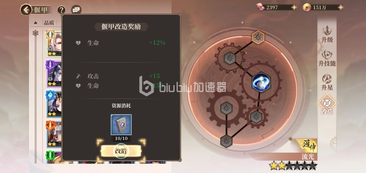 升级技能在“升技能”界面操作,只有两个方法:一是使用相同的偃甲,二是使用“黑阿往”,每个材料只能升1级技能,而且难点在于技能加点是随机的,不是指定的。