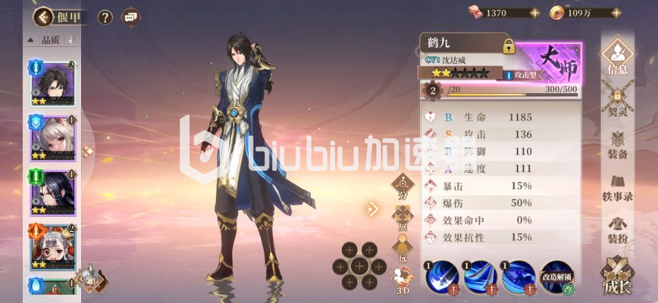 要问哪个角色是官方的“亲儿子”,那没有人能和鹤九比,直接便是故事的主人公,剧情的主观视觉,列表中排在第一个,标准的紫色大师品质,妥妥的一号人物,通过面板也可以看到攻击为S品质,实力绝对够硬。