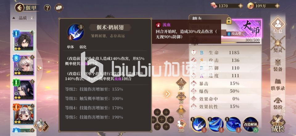 鹤九的第一技能鹤展翅是单体高伤害,并且还同时附带高概率的流血效果,改造后更是可以打出三段伤害,段数越多自然好处就越多,暴击后伤害的累加要多得多。
