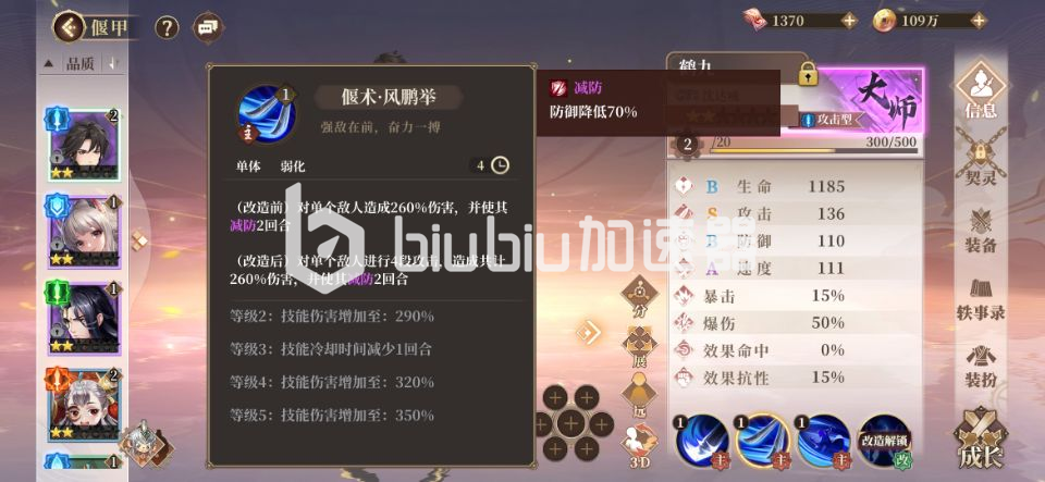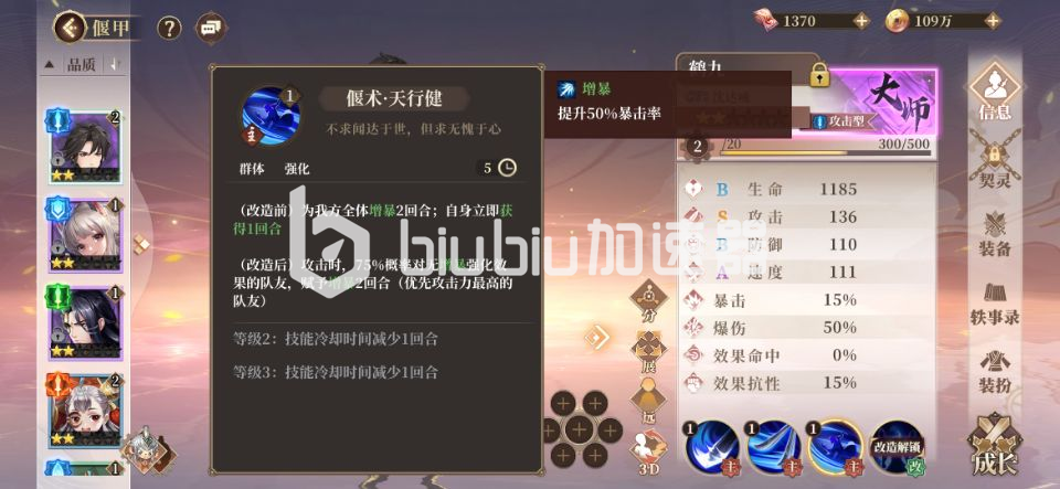 三技能天行健是状态类技能,为我方全体增加暴击的效果,并且逆天的是还可以额外获得一个回合,这样我们在先手中使用完全相当于两个回合同时用,自身还额外增加了暴击,何乐不为呢。
