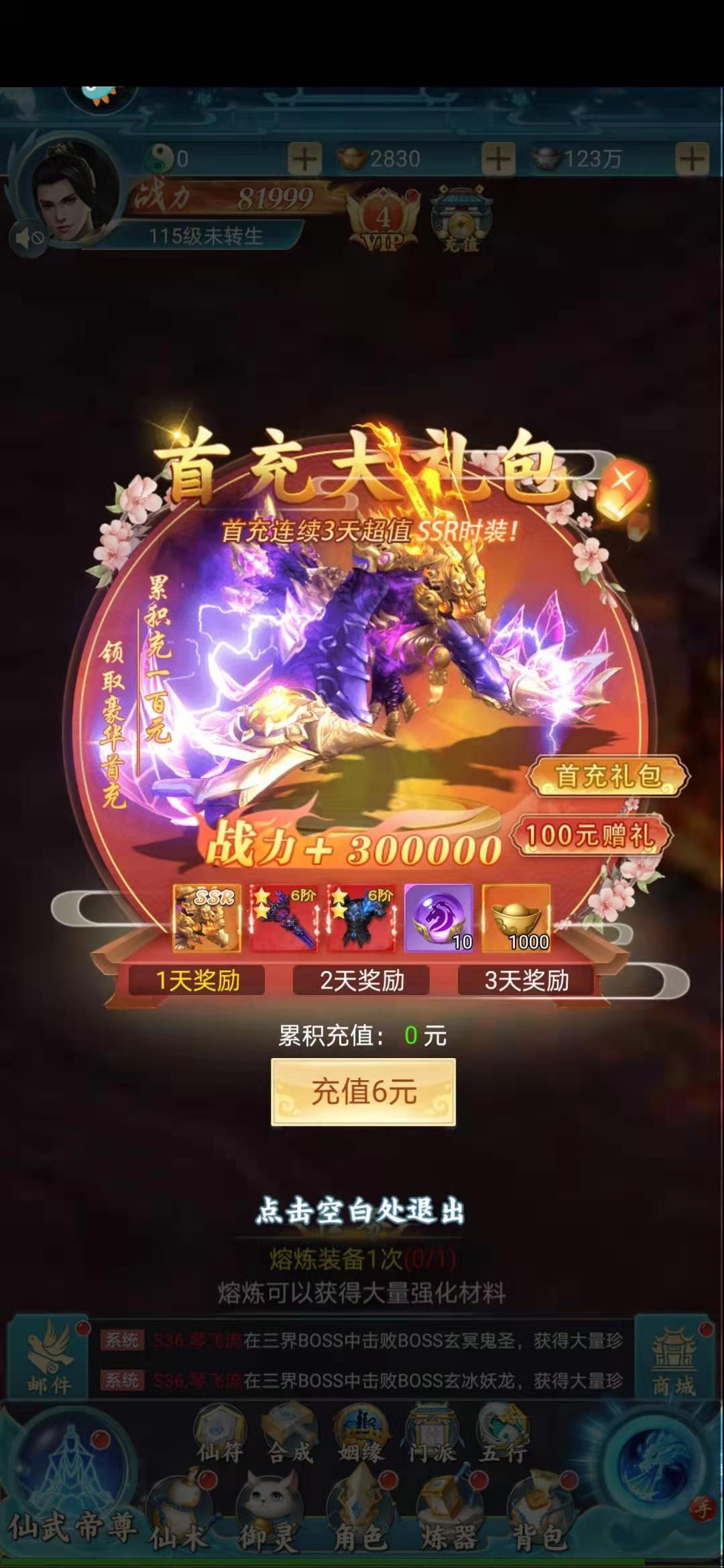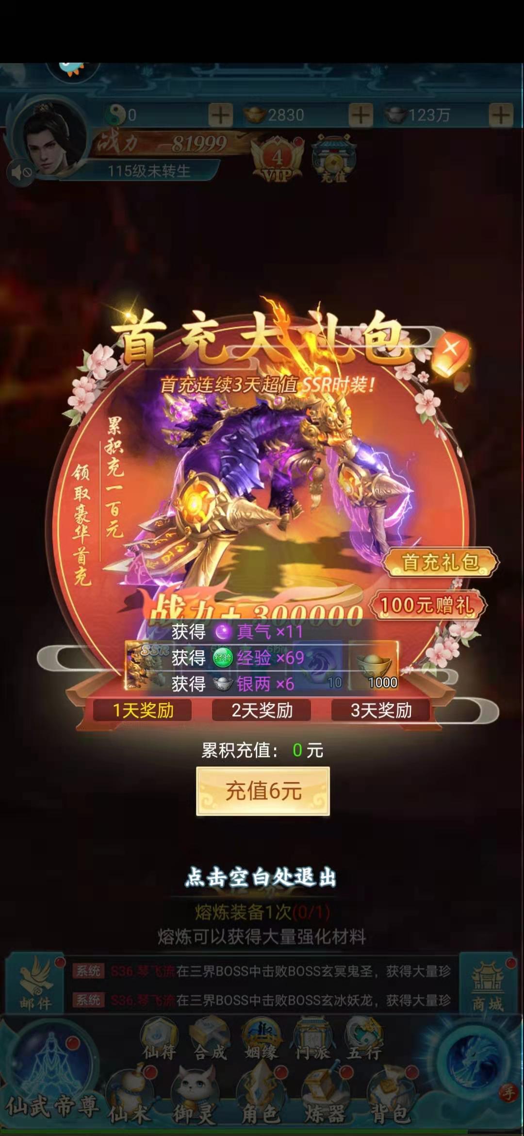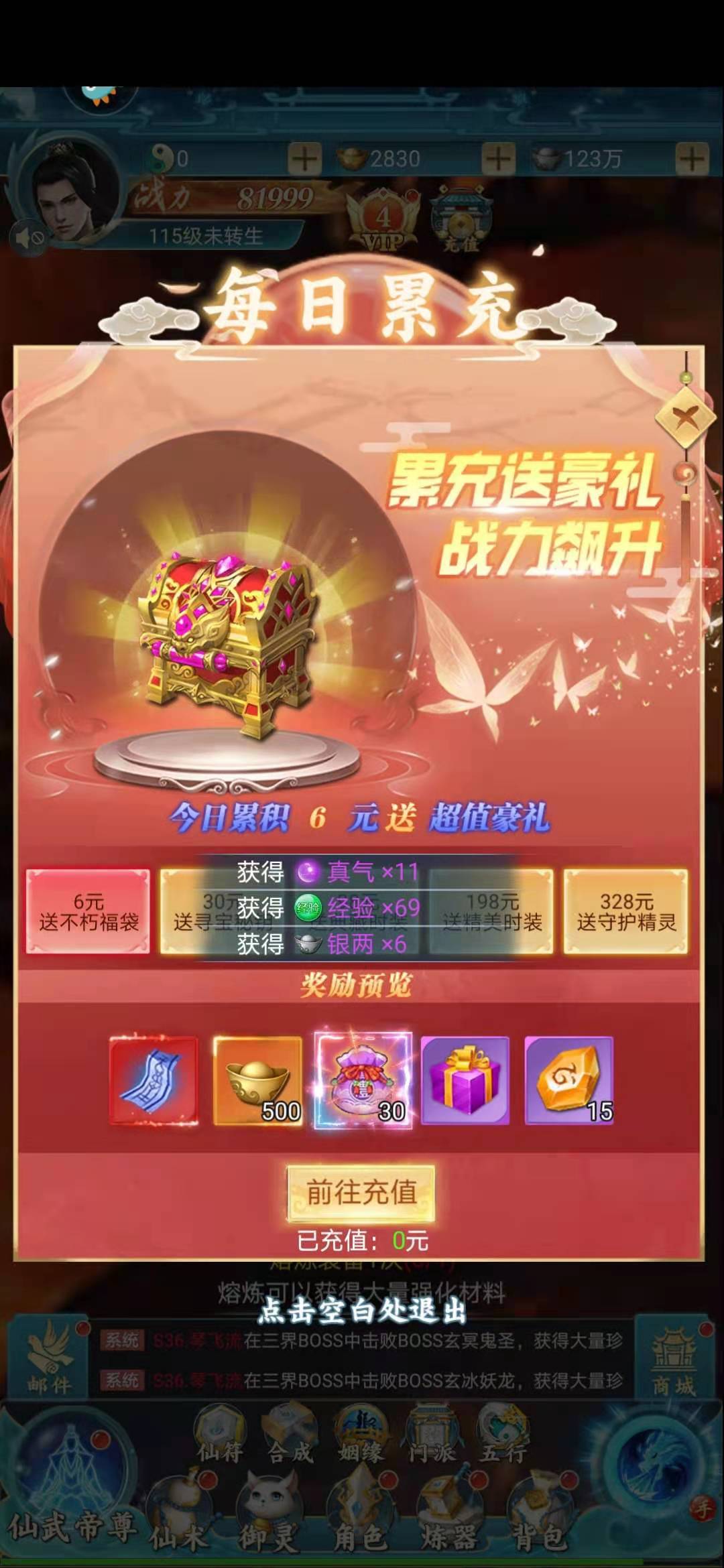 游戏中还有一个今日累积6元,即可获得超值礼包的条款,可以帮助玩家迅速提高自身的战力。