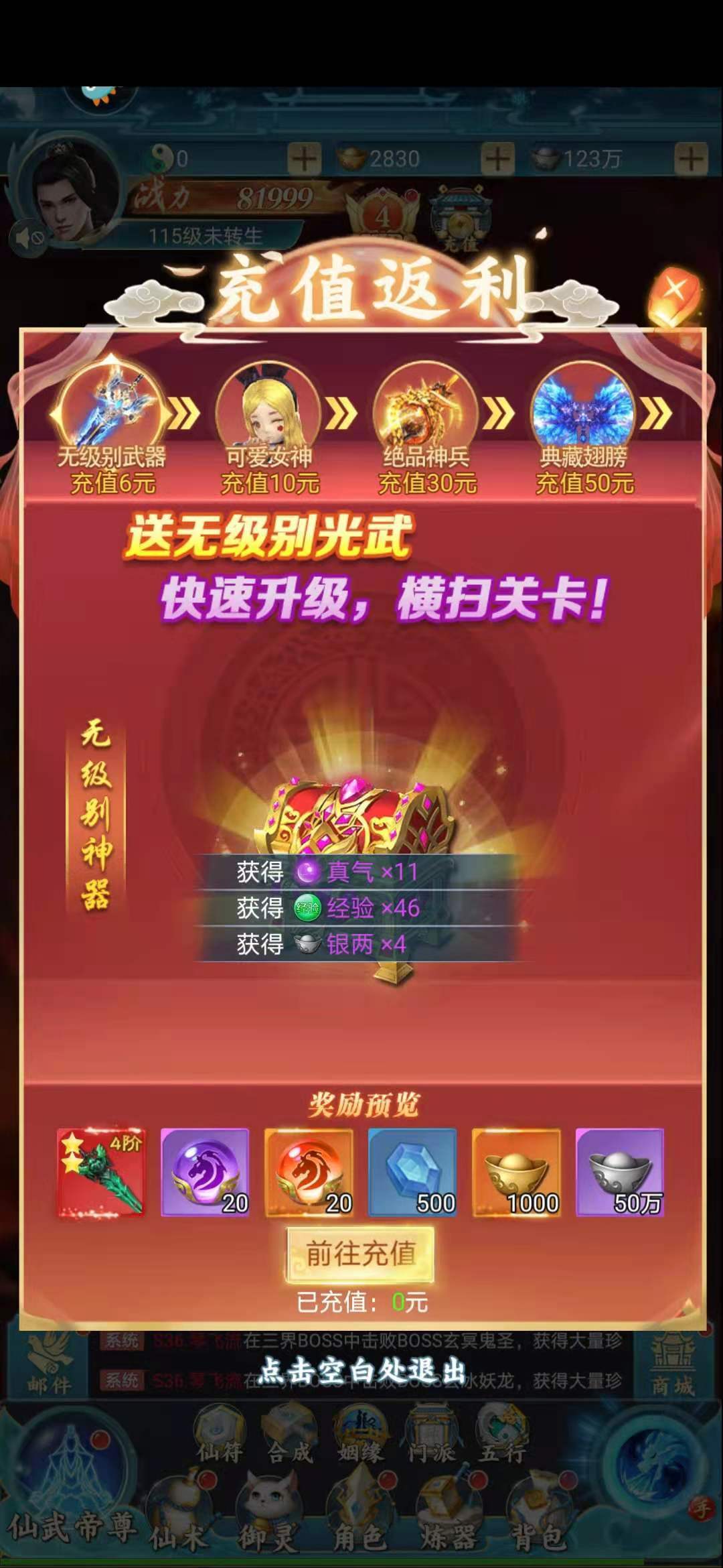 想要获得无级别武器,可以直接充值6元,即可获得!当充值10元的时候,可以获得一个可爱女神辅助,最后只要充值30元,即可得到绝品神兵,而典藏翅膀,也只需要50元,所以这个奖励是很丰厚的。