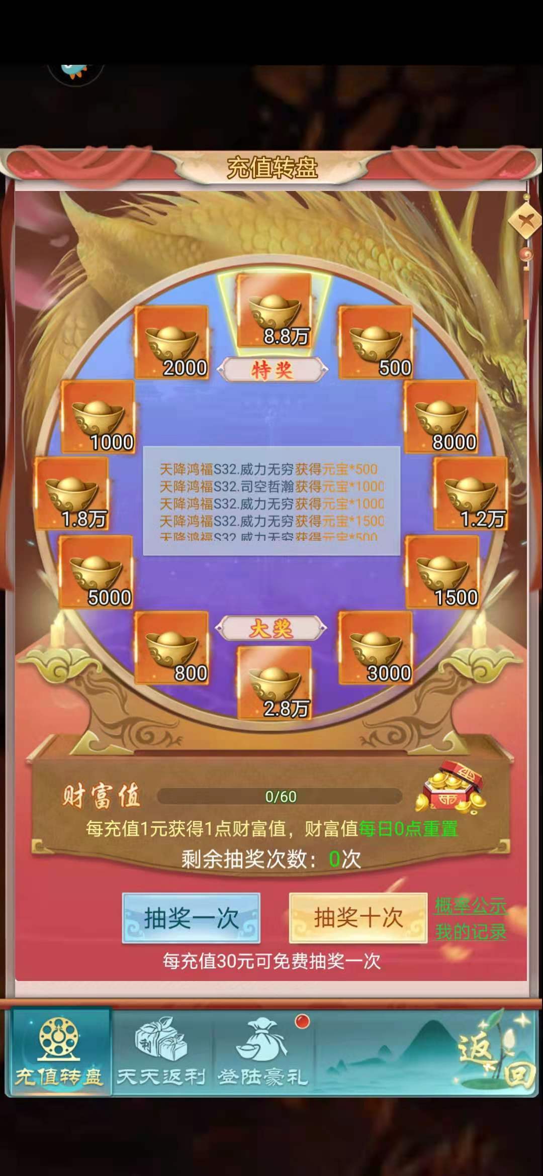 在这个选项里,只需要30元即可抽奖一次,而最大的奖励就是那8.8万的元宝奖励,有这些钱又可以提升战力,同时这个选项还有天天返利和登录豪礼,可以获得不少的游戏特等奖。