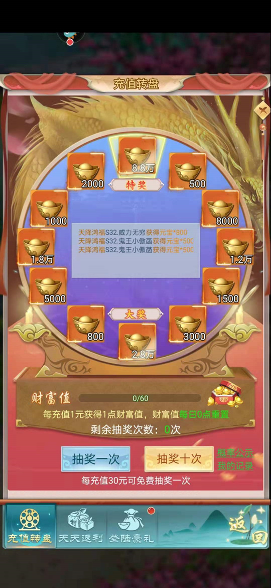 在古剑奇闻录中,可以选择抽奖转盘进行元宝的获取,每次只要充值30元,就有一次抽奖机会,最低500元宝,最高8.8万,有这个方式,抽到8.8万就可以把战力提升很多了!