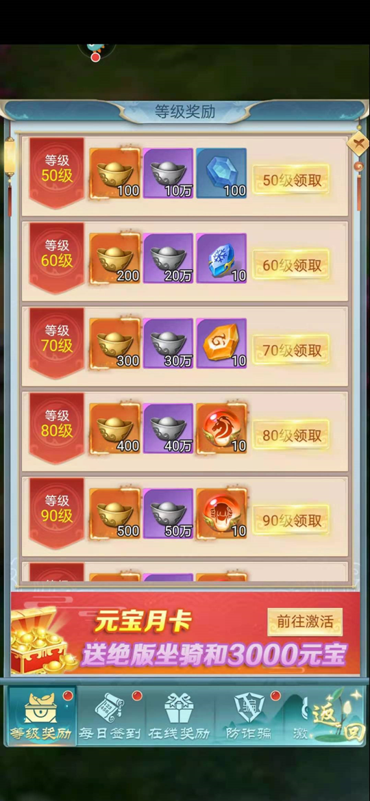 玩古剑奇闻录的玩家可以选择性地进行一些闯关做任务的活动,当每次等级提升10的整数位,那么就很容易得到元宝,点击等级礼包领取,就能得到不少的元宝奖励。