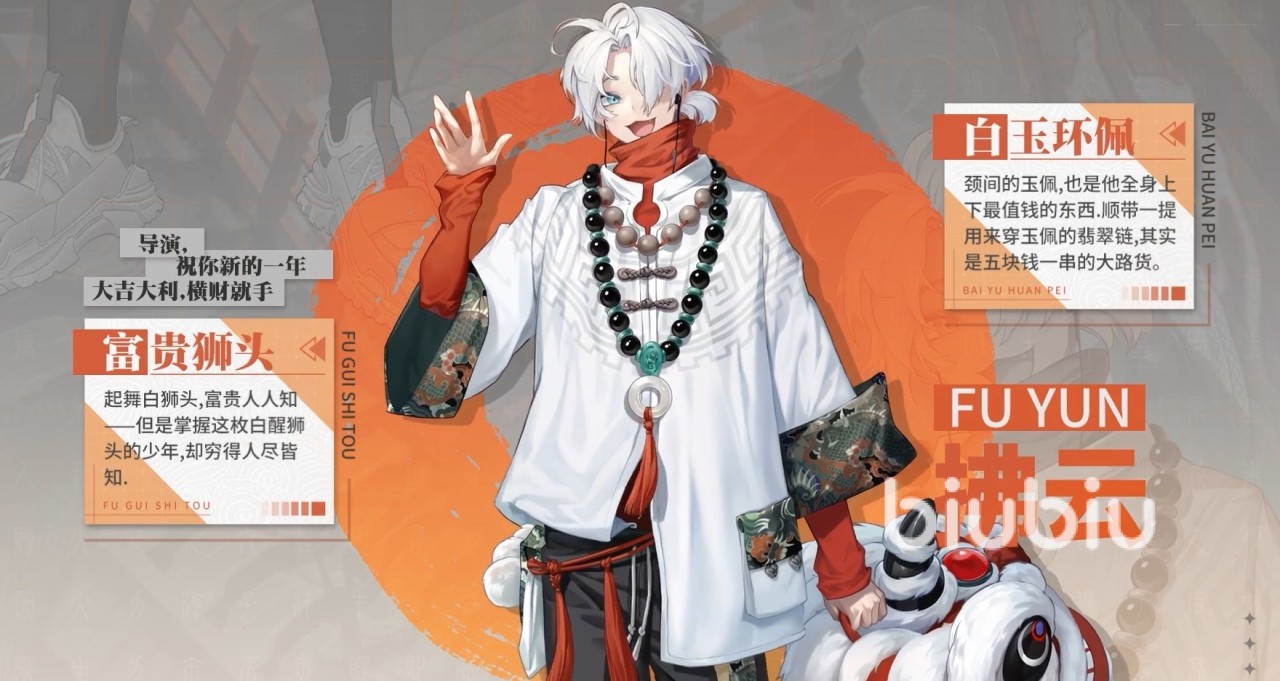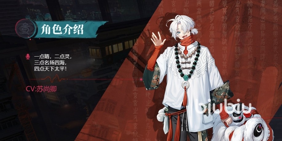 他是文殊醒师团的大师兄,也是狮子区当中赫赫有名的白狮王。这一点从他立绘当中手持的舞狮头套可以看得出来,并且他还是整个醒狮团的掌门人,按照背景故事来说,非常的富贵,具有相当多的财富。不过与背景不符的是,角色本身却相当的乐天派,并且对于身上富贵这点完全没有认知,不知道该如何使用这些钱财。