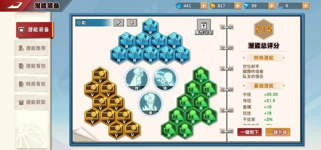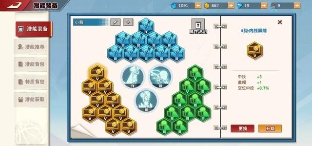 首先要加的就是黄色潜能----内线屏障,将最主要的得分手段中投升满,一共是加30的中投,并且还有一手不错的盖帽,可以让仙道在攻防两端极具威胁。