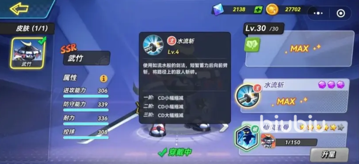 武竹的天赋是在进攻到对方两分区的时候,进行后仰跳投会提升命中率,并触发一段向后的闪身,再加上他的基础数值面板,使得他在两分区得分率高,有着多样的手段,他的“水流斩”会运用高超的剑法,在短暂蓄力后向前劈砍,将路径上的敌人给斩倒在地,同时对方手中有球,也会使球掉落,他的普攻分成3段,第3段会将敌人击倒,并附带一个小范围的穿刺,能给对手意想不到的一击;