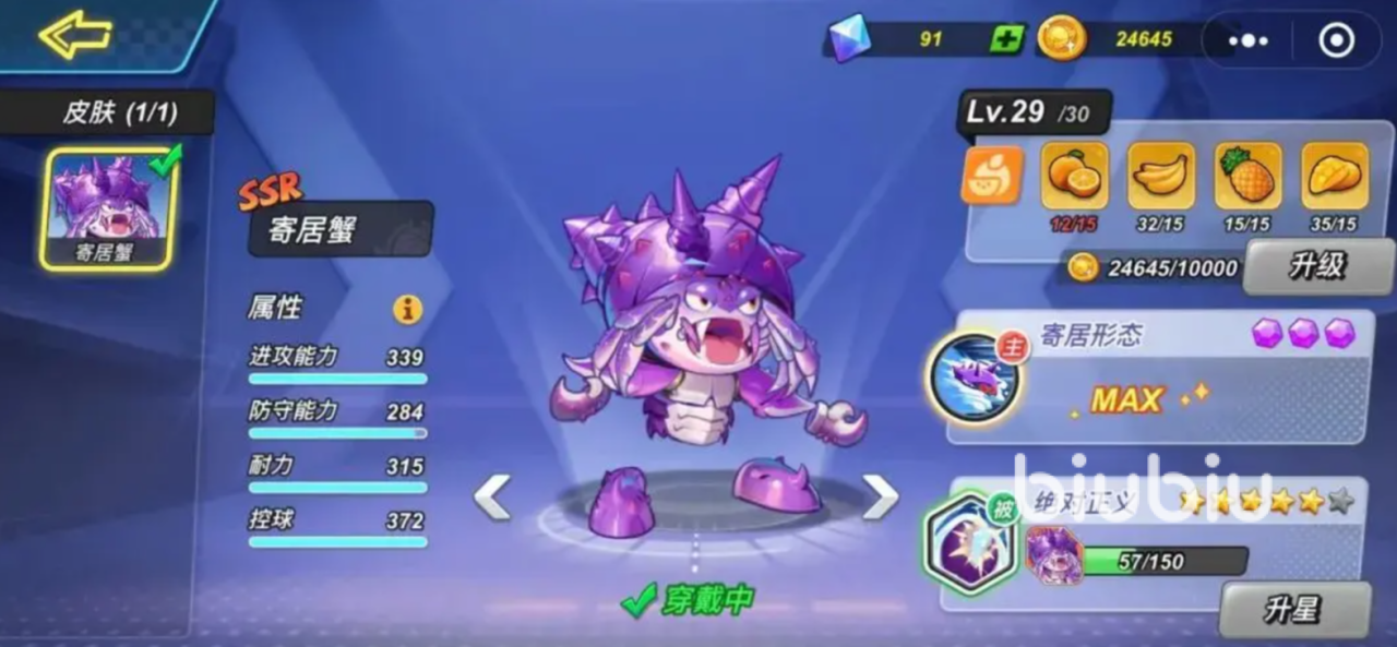 寄居蟹十分灵活,可以变小自己的身体快速移动,并随时发动猛烈一击,他的主动技会钻入自己的壳中,进入到寄居形态,此时身形变小并且移速加快,最关键的是任何敌人的普攻都无法命中,此时点击普攻会使用蟹钳一击,将上方的敌人给夹碎,这个角色弱点是跳跃高度会相对比较低,因此在面对那些擅长高跳河二段跳投篮的对手时,千万不要盲目跟随他们跳跃,不然不仅无法挡住球,还会被对方给得分,最佳策略是用特殊形态来规避这一问题,在敌人跳起的时候看准时间夹击,然后抢球并投篮;