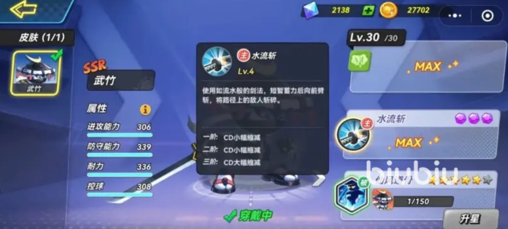 武竹的天赋是在进攻对手两分区后,进行后仰跳投能自动触发后撤闪身,并且提升命中率,在加上数值面板的加成,使得其在两分区的得分率高,并且手段多样,是各类角色中两分得分最强选手,他的主技能会用像是水流一样的剑法,在短暂蓄力后向前劈砍,将路径上的敌人斩倒在地,对方如果手中有球,球也随之掉下,玩家可以趁机夺取对方手中的球并拿下分数;