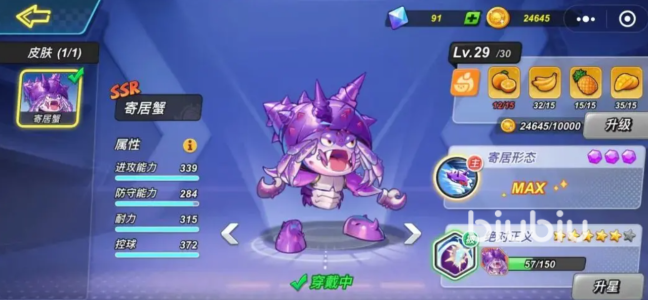 寄居蟹的特点就是灵活,可以让自己变小快速移动随时发动攻击,他的主动技会钻入壳子里变成寄居形态,简单来说就是变成一个移动速度超快,且敌方的普攻无法命中的形态,此时点攻击键可以将上方的敌人给夹碎,由于其有着跳跃高度较低的缺陷,所以在面对那些擅长高跳的对手时,千万不要跟随他们一起跳,而是看准他们的起跳时机进行夹击,随后抢球利用速度优势投篮;