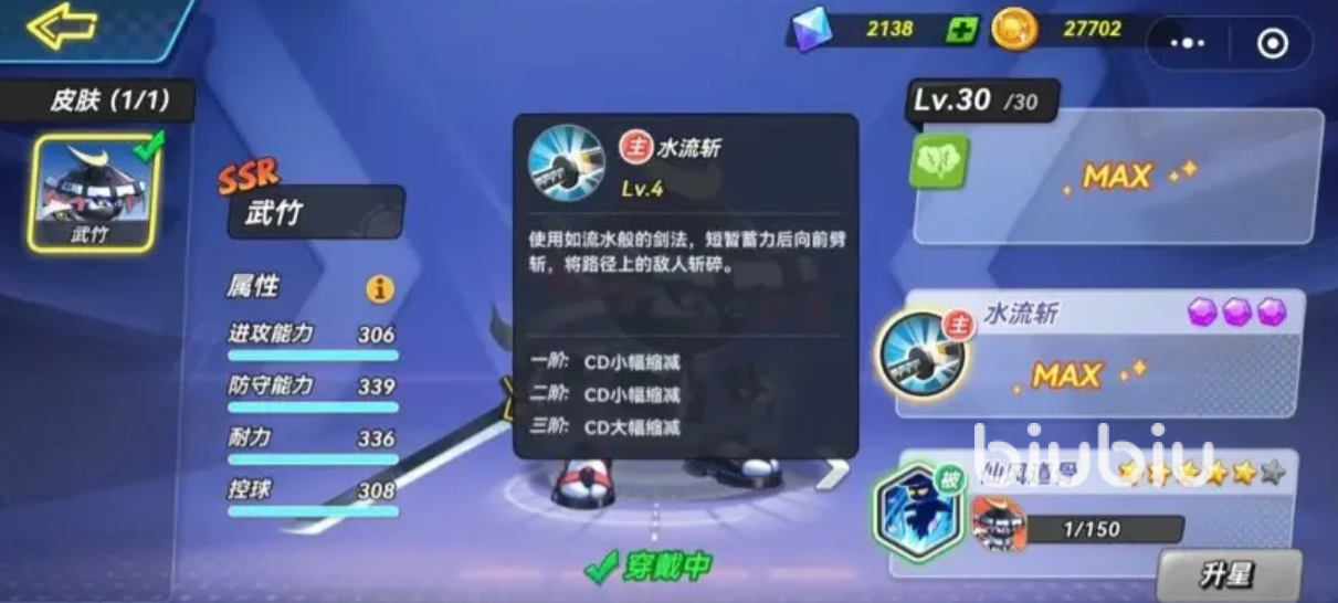 武竹从数值面板上看,两分球进攻能力比较突出,他的天赋能在对手两分区进攻时,触发一段小幅度的后撤转身,并且能提升命中率在进球后回复少量体力,这让其成为两分得分最强的球员,他的“水流斩”会运用高超的剑法,短暂蓄力后将对手给斩倒在地,如果对方此时持皮球,皮球也会随之掉落,从而帮助后续的争抢,他的普攻总共有3段,根其他英雄一样第3段会将敌人给击倒,但他比较特殊的是,第3段会额外附带一个突刺能力,可以靠这个来给予敌人额外伤害。