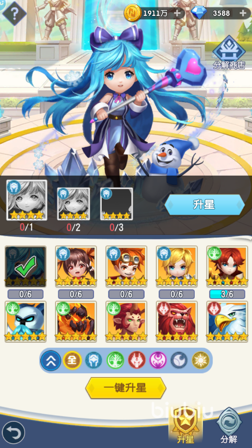 抽完卡以后我们就要开始培养这些卡片了,游戏内从主页的右上角“英雄神殿”进入,就可以开始将这些角色进行升星了,并且还可以将手上没有用处的角色分解出更多的材料用于升级升阶,等全部弄好后点击“英雄”,再点击“阵容”就可以一件上阵进攻队伍以及防守队伍了。