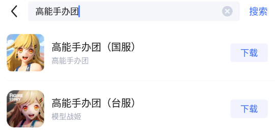 在搜索框中输入并搜索“高能手办团”。此时,大家可以看到这里有两个下载选项,因为这款手游在国服和港澳台地区均有运营。本文将以台服为例向大家介绍这款手游的加速方法。