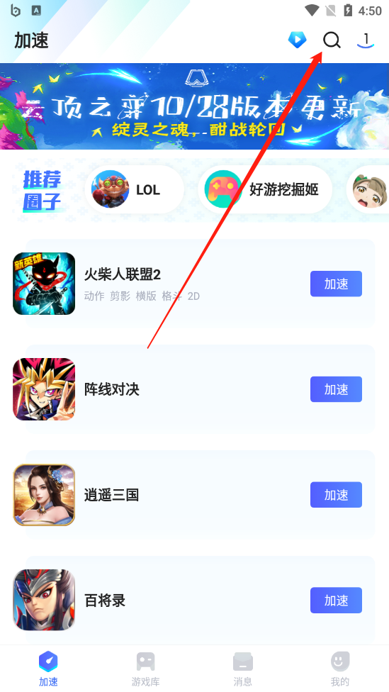 首先下载这款手游,大家打开biubiu加速器,然后在首页右上角找到这个图标,点击即可进入搜索游戏的地方。